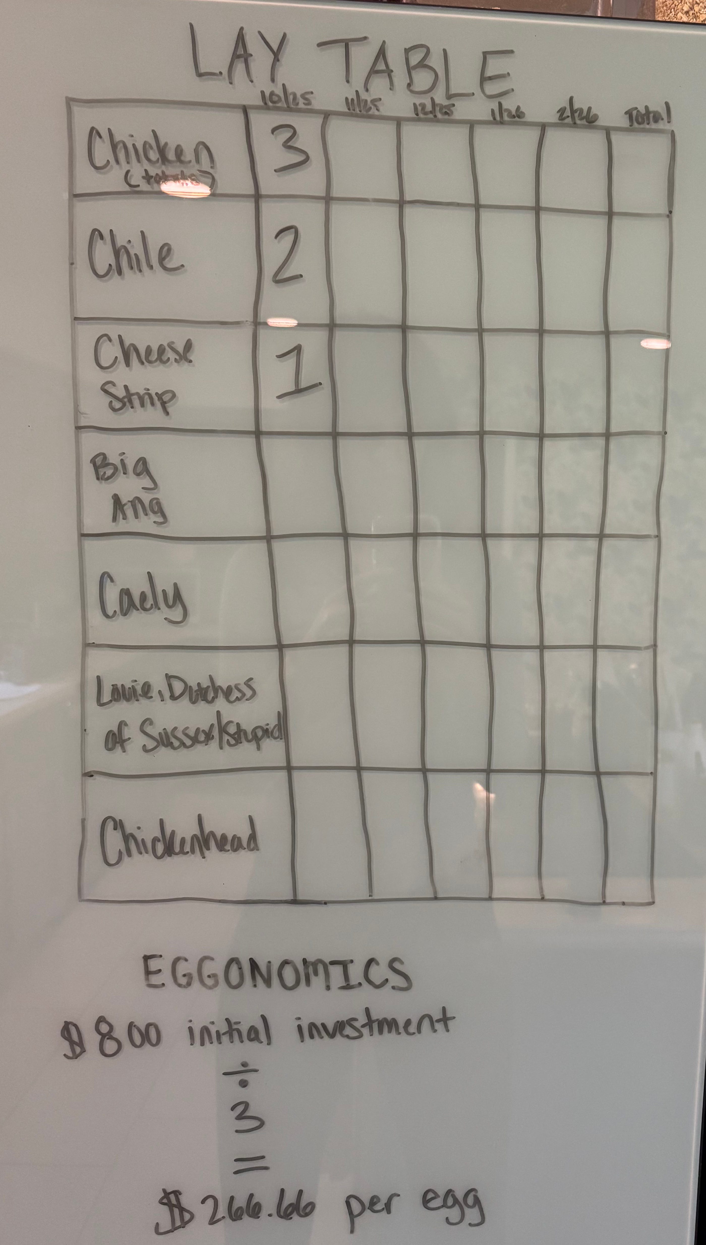 All 6 of Bethany’s chicks are alive and well despite the odds. They laid their first eggs!! She has started a ‘lay table’ where her family is tracking the “Eggononics” of their investment (approximately $800) vs. how many eggs the chicks produce. So far, each egg has cost $266.66 but things can only go up from here.